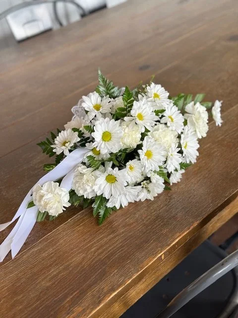 The original bridal bouquet was a mix of white daisies, white carnations, and fern. The recreation was very similar with a mix of white daisies, white carnations, white wax flower, fern with a lace collar and white satin streamers. We were excited to use an older technique of building the flowers in a bouquet holder. We had a difficult time finding the lace collar and holder as they are just not really used much now. One thing that truly surprised us was how gorgeous the simplicity of this bouquet was. It was charming and sweet!! We use very complex recipes and designer flowers most of the time and the simplicity was a breath of fresh air.